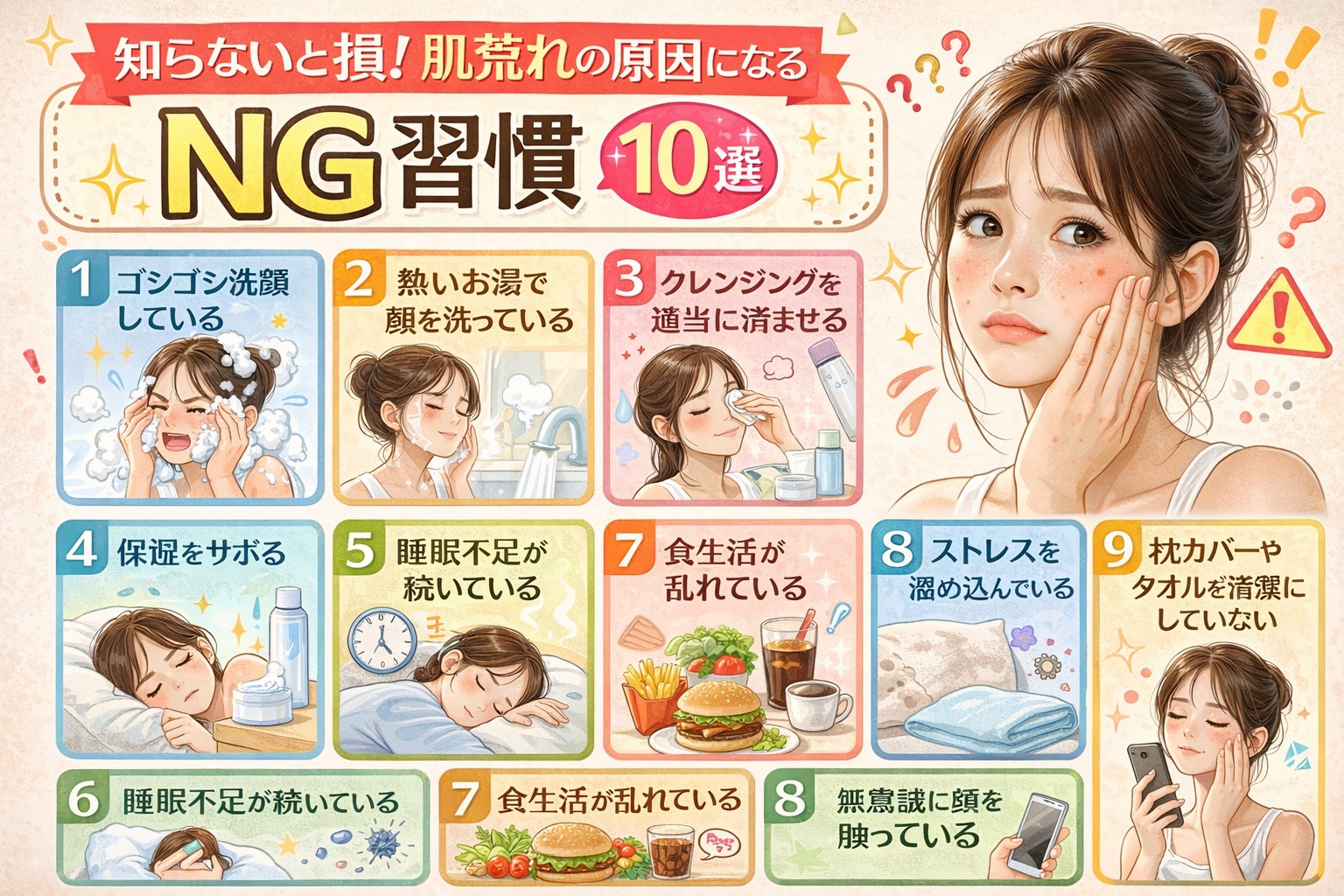 この記事では、多くの人が無意識にやってしまっている「肌荒れの原因になるNG習慣」を10個紹介します。